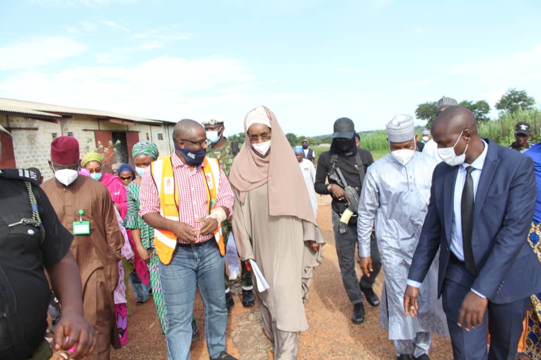 The Minister Of Humanitarian Affairs, Disaster Management and Social Development, Sadiya Umar Farouq and the Director General of the National Emergency Management Agency (NEMA) AVM Muhammadu Muhammad (Rtd) at tye weekend stormed Kaduna State with over 109 truck loads of grains as COVID-19 palliiatives and other relief items for flood victims.