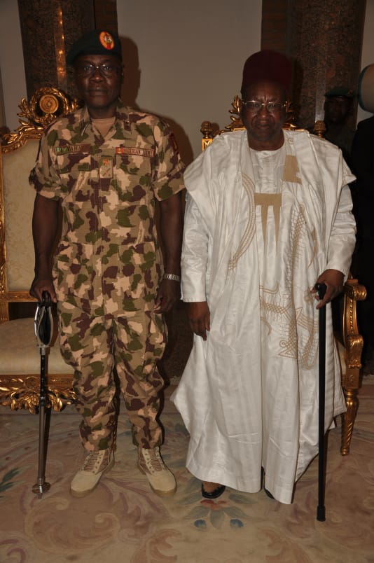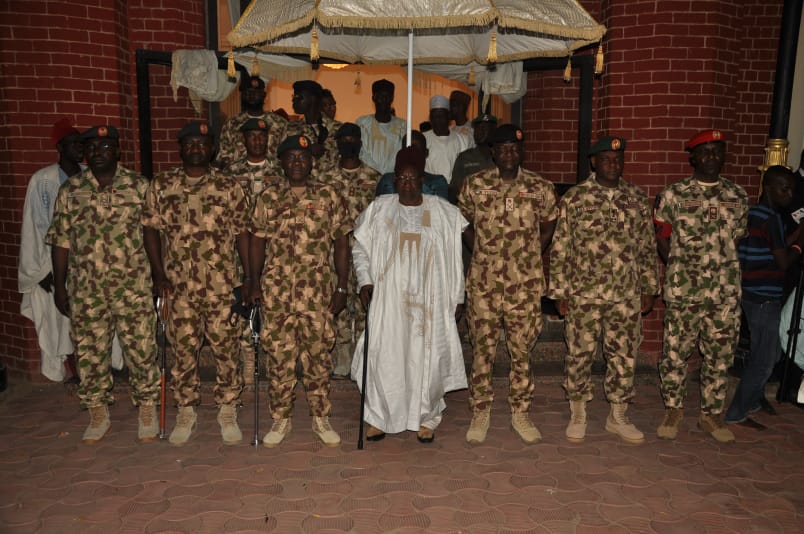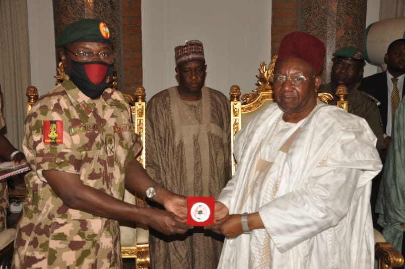 The COAS was accompanied to the palace by the Chief of Operations (Army) Major General Ibrahim Yusuf, other Principal Staff Officers at the Army Headquarters, Theatre Commander, Operation HADIN KAI, Major General Christopher Musa, Acting General Officer Commanding (GOC) 7 Division and Commander, Sector 1 Operation HADIN KAI, Brigadier General Abdulwahab Eyitayo and other senior officers.