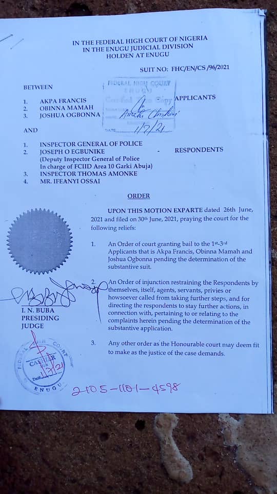 Speaking on behalf of over 15 lawyers representing them, Barr. Valentine Umeha said that the applicants, Akpa Francis, Obinna Mamah and Joshua Ogbonna through their team of lawyers, stormed the court seeking to enforce their fundamental rights to life, liberty and dignity via the notice of application filed on June 30, 2021 in Suit No. FHC/EN/CS/96/2021.