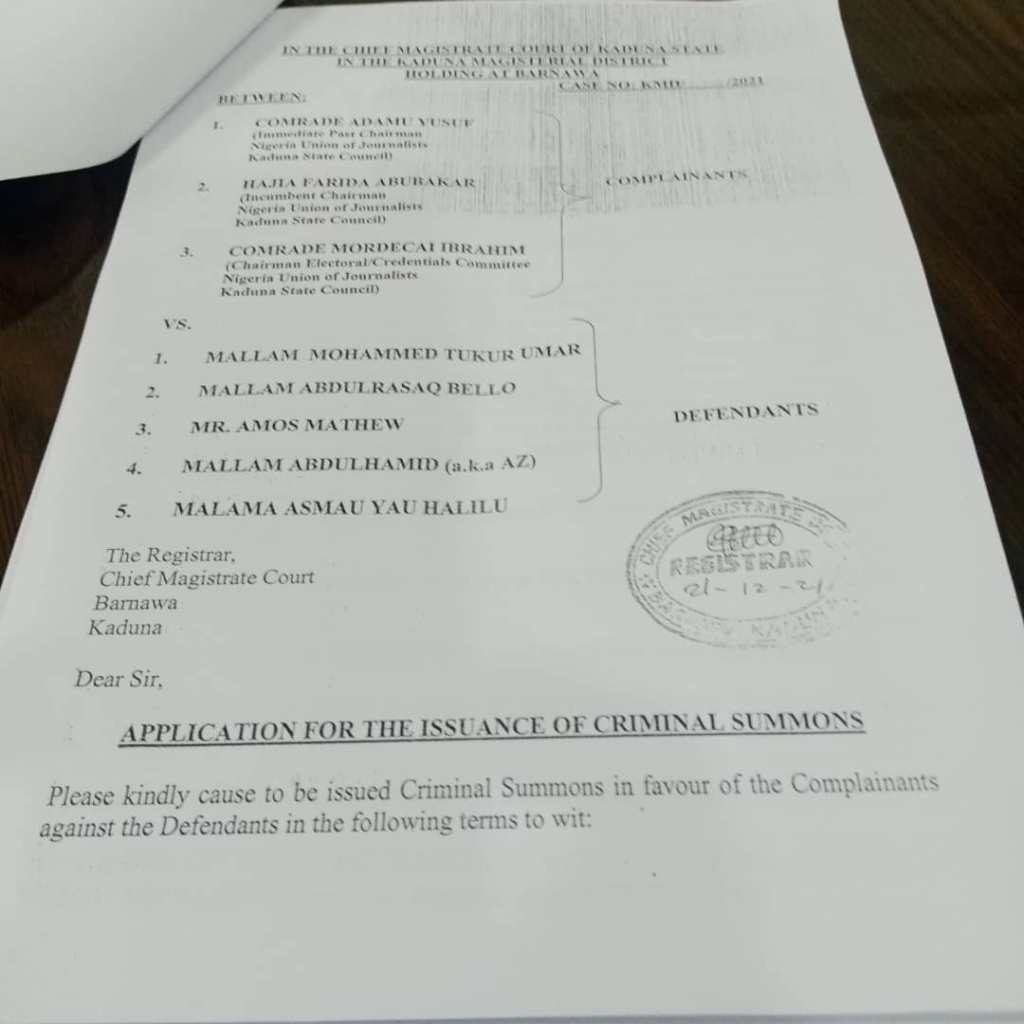 Following the alleged illegal entry into the premises of the Nigeria Union of Journalists (NUJ), Kaduna State Council Secretariat and purported swearing in of a faction vying for leadership roles in the council after an official swearing-in of Farida Abubakar as the chairman of the council on December 16, 2021, a Chief Magistrates Court in Barnawa has summoned some believed to be key actors in the act.