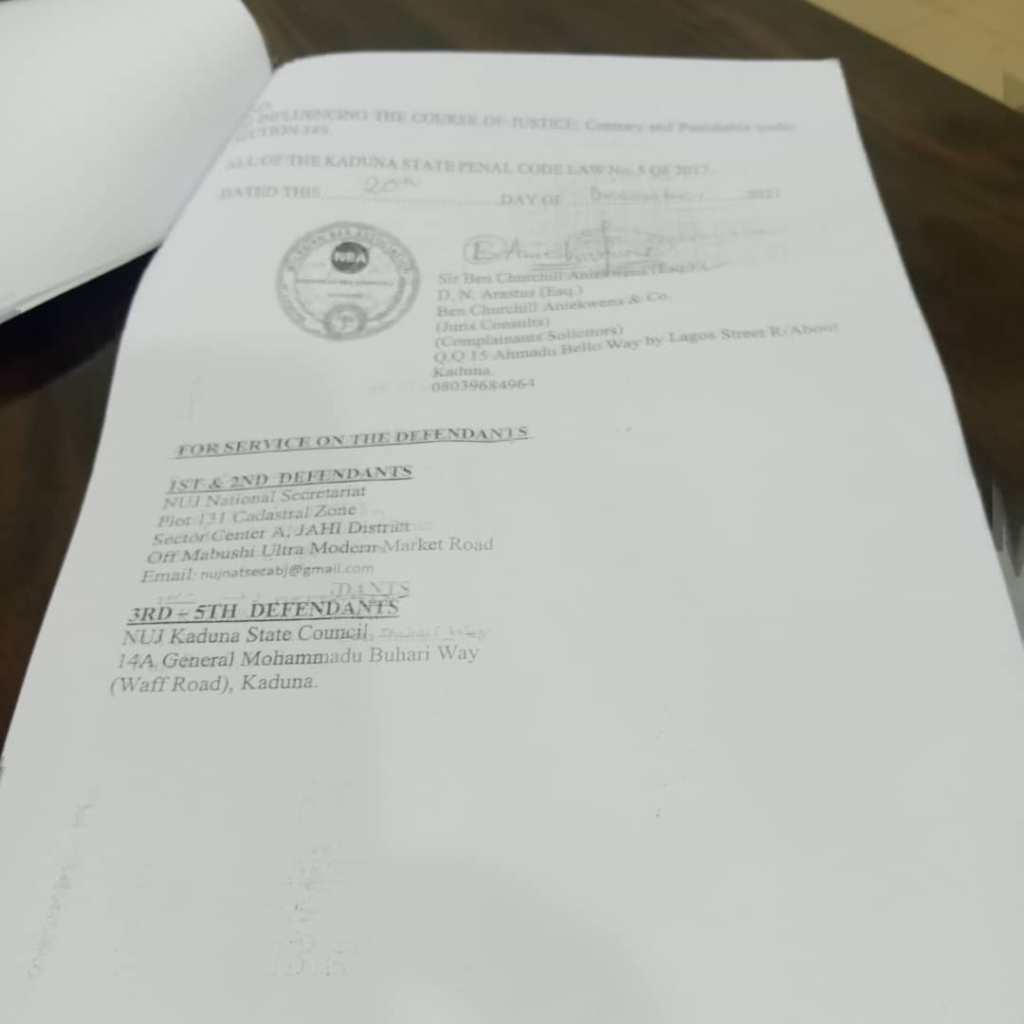justice for purposes of causing mischief and their false bid at fraudulently seizing the Kaduna State Council of the union and it’s constitutional leadership and in total unwarranted barbaric action and on the face of the pending High Court Suit No KDH KAD 1244/2021 Between the third claimant Vs National President (NUJ) &