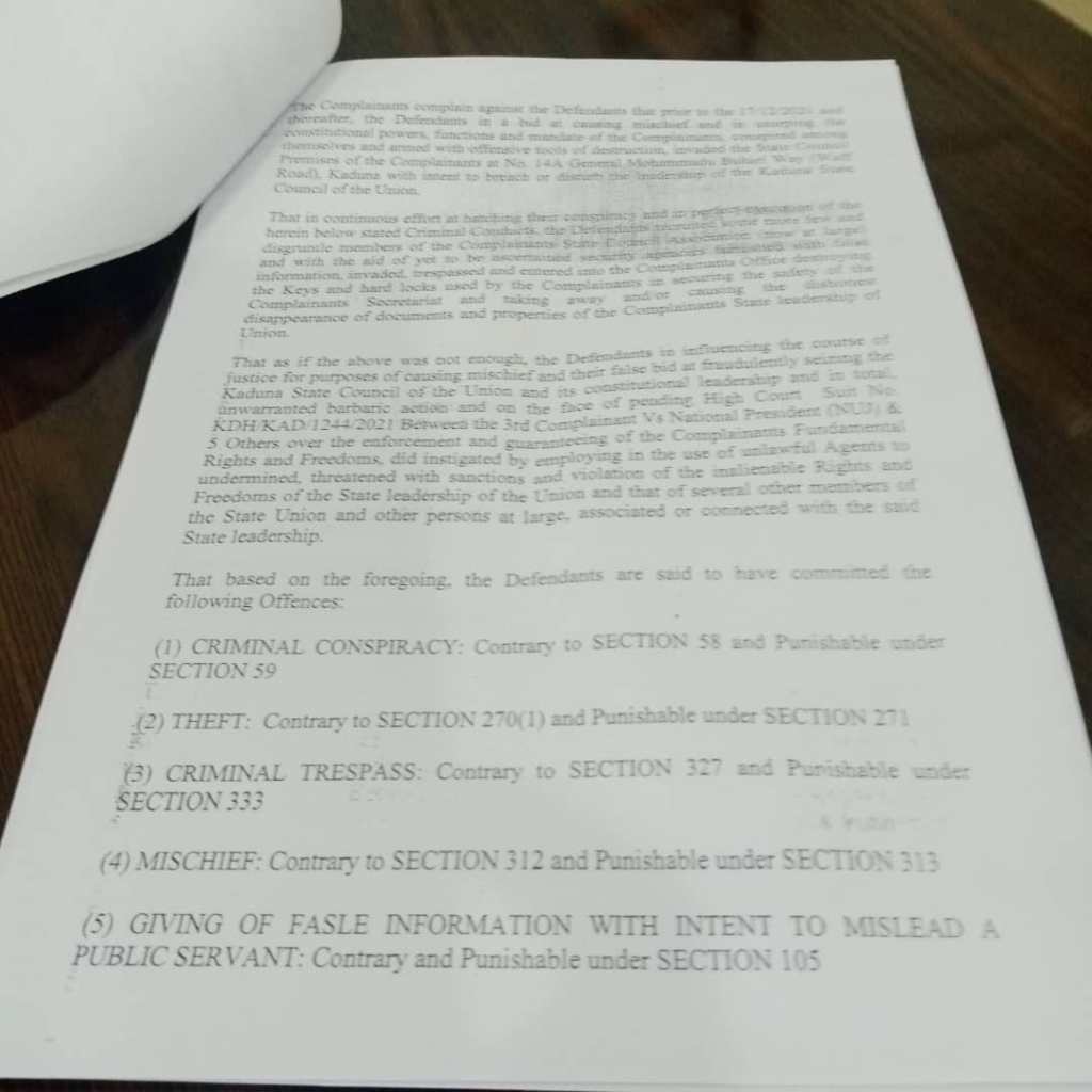 “The complainants complained against the defendants that prior to the 17/12/2021 and thereafter, the defendants in a bid to cause mischief and in usurping constitutional powers, functions and mandate of the complainants, conspired among themselves and armed with offensive tools of destruction, invaded the state council premises of the complainants at no 14A Muhammadu Buhari Way (Waff Road) Kaduna, with intent to breach or disturb the leadership of the Kaduna State Council of the union.