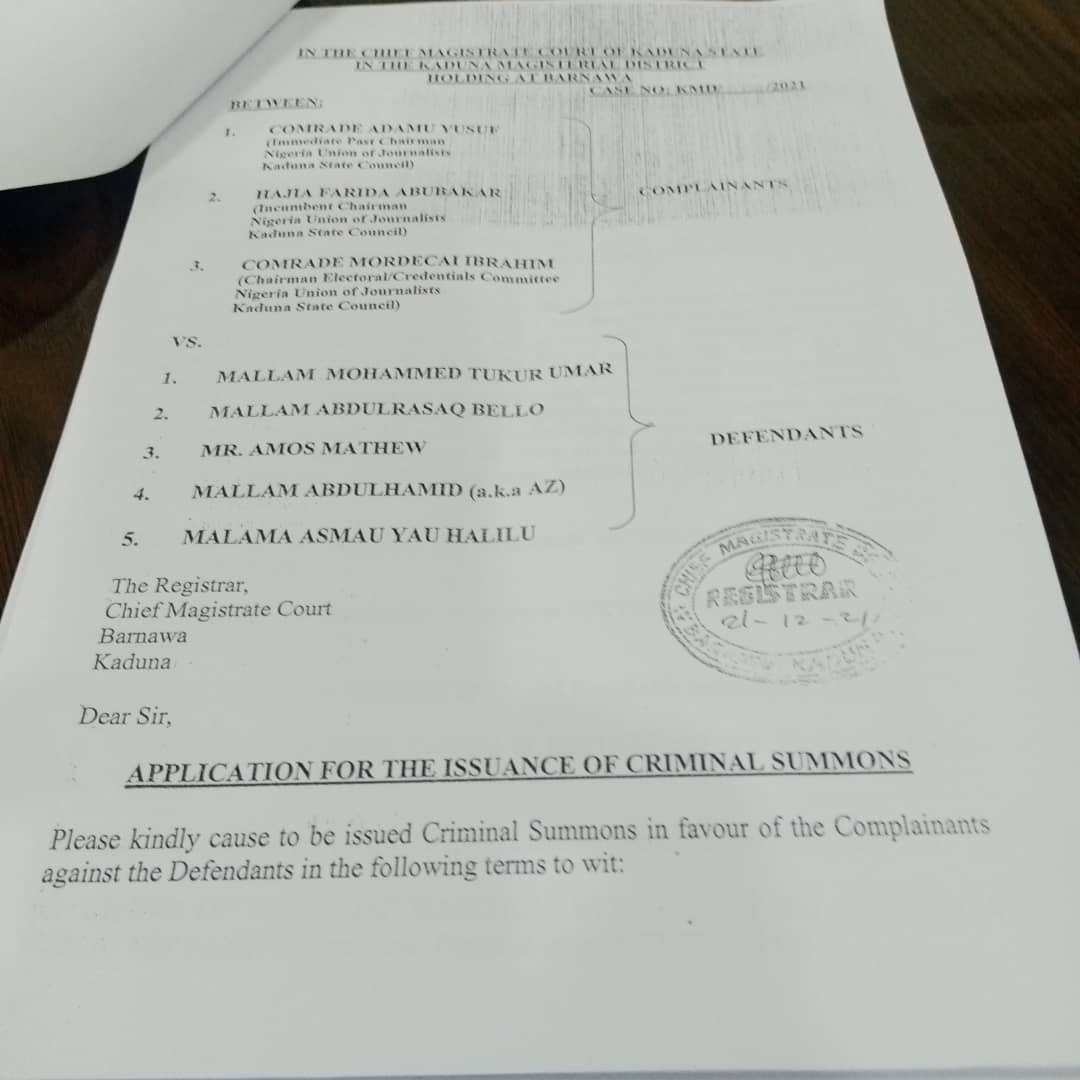 Following the alleged illegal entry into the premises of the Nigeria Union of Journalists (NUJ), Kaduna State Council Secretariat and purported swearing in of a faction vying for leadership roles in the council after an official swearing-in of Farida Abubakar as the chairman of the council on December 16, 2021, a Chief Magistrates Court in Barnawa has summoned some believed to be key actors in the act.
