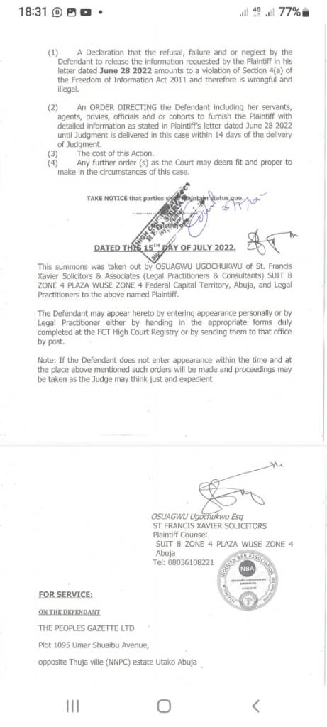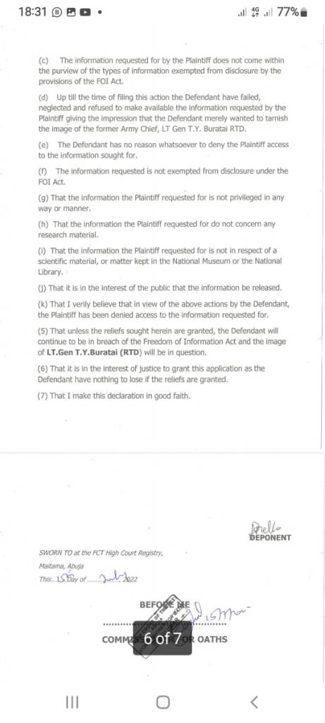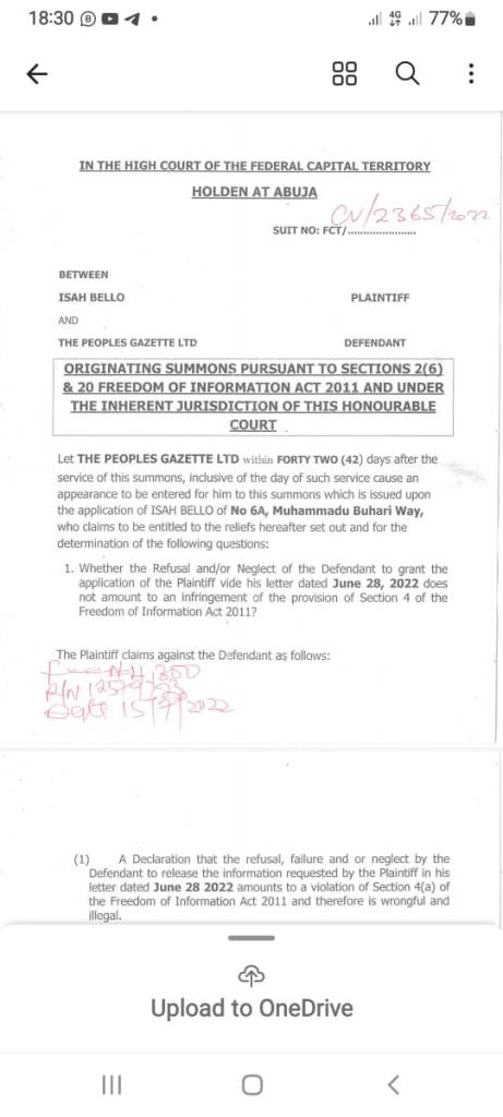 (1) A Declaration that the refusal, failure and or neglect by the Defendant to release the information requested by the Plaintiff in his letter dated June 28 2022 amounts toa violation of Section 4(a) of the Freedom of Information Act 2011 and therefore is wrongful and