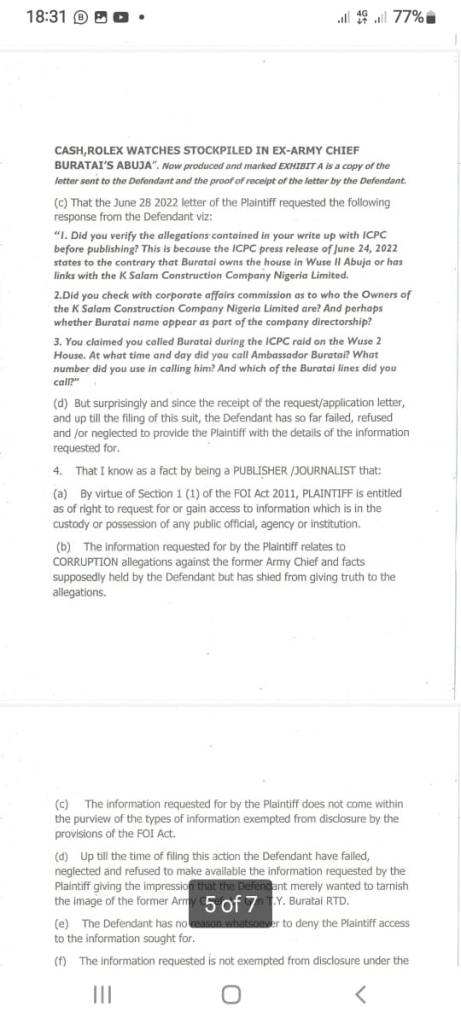 “1. Did you verify the allegations contained in your write up with ICPC before publishing? This is because the ICPC press release of June 24, 2022 states to the contrary that Buratai owns the house in Wuse lI Abuja or has