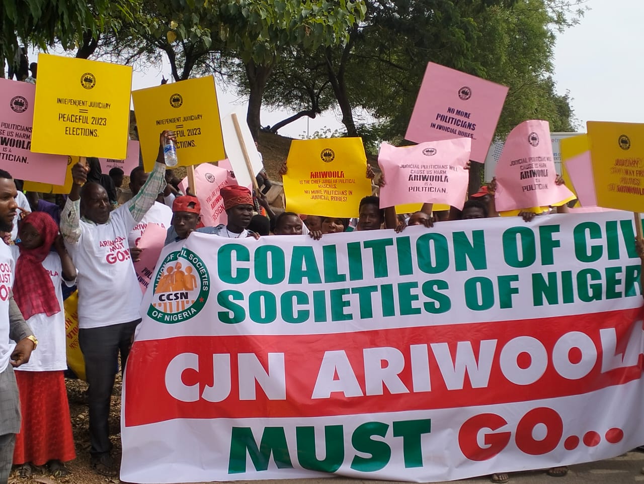 Among the inscriptions on the placards were; “You are partisan, Ariwoola resign now”, Judicial politicians will cause us harm, Ariwoola is a politician”, “We demand independent judiciary, peaceful 2023 general elections”, and “No more politicians in judicial bodies, among others